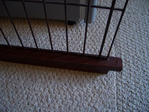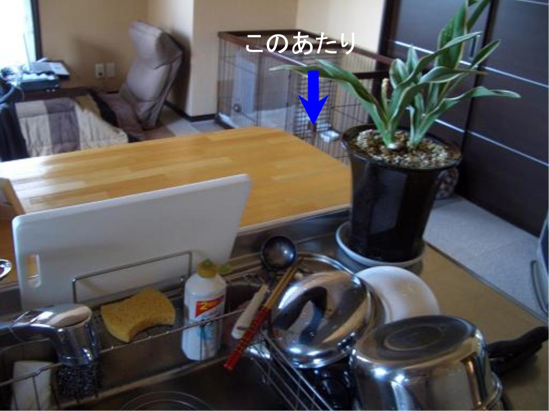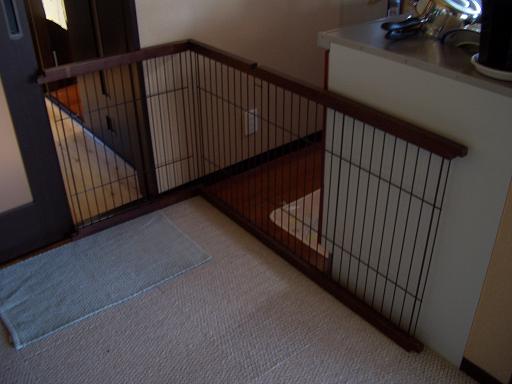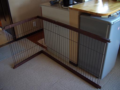 キッチンへのこの場所は普段は昔使っていたサークルの一部を使った柵があります。
