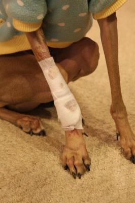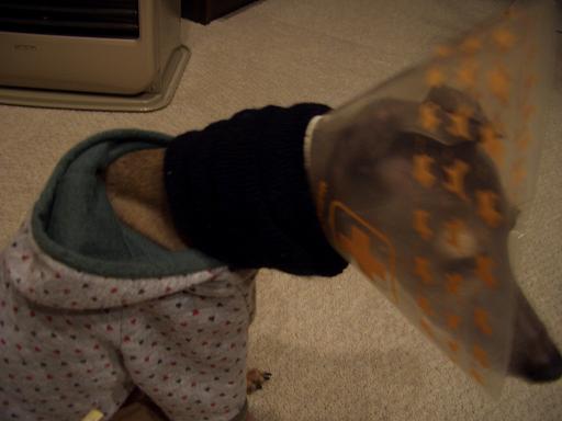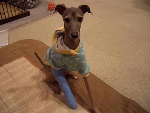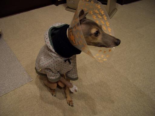 今でもあまり意味無いのですが、イタグレは首が長いので遊びが多くて全く何にもエリザベスカラーの意味がなかったのですが、ミネパパの靴下切って首にはめたら少しは固定されました(笑)