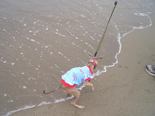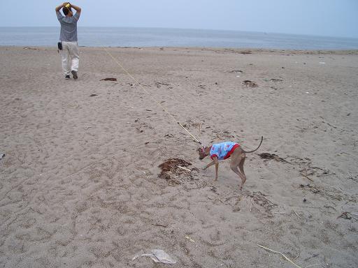 ロングリードをつけて、さあ海に行くぞ♪なんて張り切って砂浜を歩いて行ったのですが、途中からミネラルさん、何か嫌なものを感じたみたいで、ちょっと歩調がゆっくりに(笑)