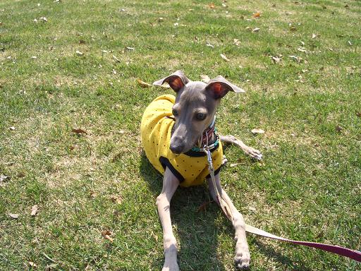 下が芝生だったので暖かかったのか?割とすんなりお座りしてしかも珍しく長い間じっと座っていたら、おじちゃんに「良い子だね~」「そんなにじっとしていられるなんて、お利口なんだね~」と言われてしまったのですが、たまたまなんです。本当に