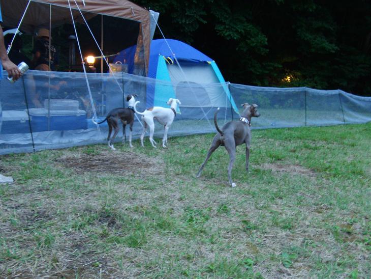 ドックランの向こう側のタープみたいなテントがBBQの食卓テントです。