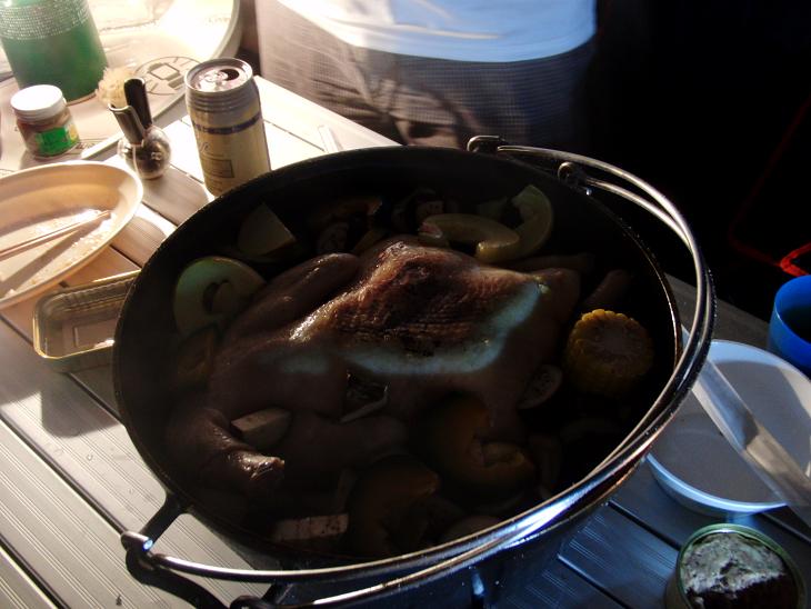 ダッチオーブンで蒸された丸鶏と野菜です。