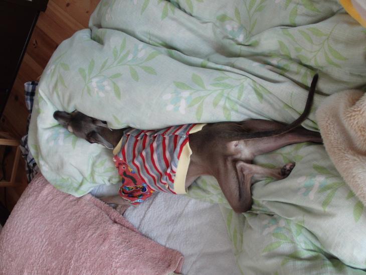 その上に保温用の毛布はいつものことですが、さらに上に私のブランケット(最近涼しいから必需品)やら、ミネパパの上着やら乗せて山盛りになっています^^;;