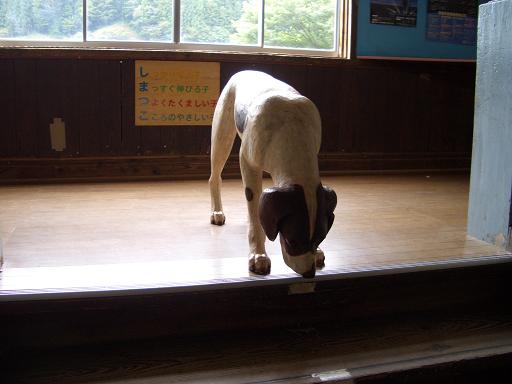 こちら廃校になった小学校の階段に展示された木彫のワンちゃんです。