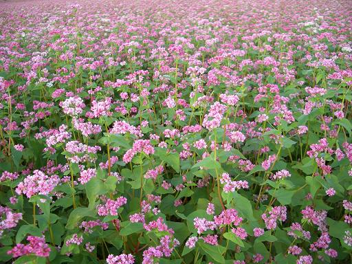赤そばと言いますが、花は濃淡のあるピンクで近くで見ると可愛く、遠目で見るとキレイなピンクの絨毯みたいな感じでした。